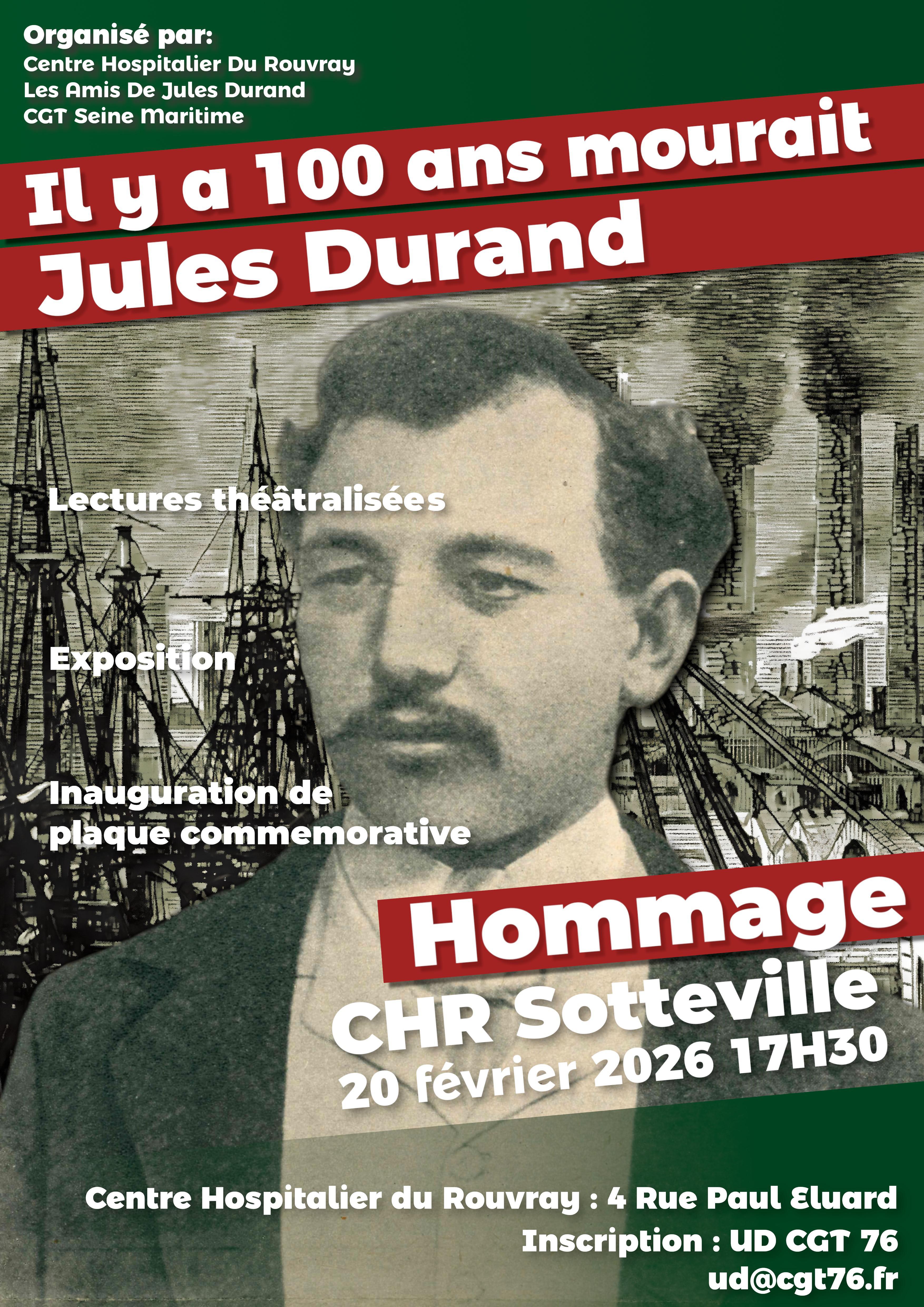 L’Union Départementale CGT de Seine-Maritime, l'association "Les Amis de Jules Durand," le Syndicat CGT du CHR et la Direction du CHR ont le plaisir de vous inviter à participer à l'hommage qui sera rendu à Jules Durand à l'occasion des 100 ans de sa mort au sein de cet établissement, le :